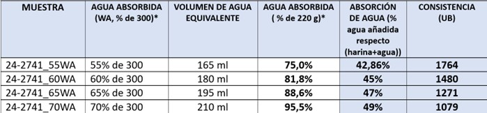 *El dato de agua absorbida, WA, expresado como % de 300, hace referencia a la graduación de la bureta del equipo, que muestra el % de hidratación para una masa de 300 g de harina.