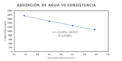 • Correlación entre consistencia y absorción de agua (calculada como % agua añadida respecto a la suma (harina +agua añadida): los datos obtenidos responden a una ecuación lineal con un valor de R2 = 0,9961.