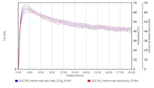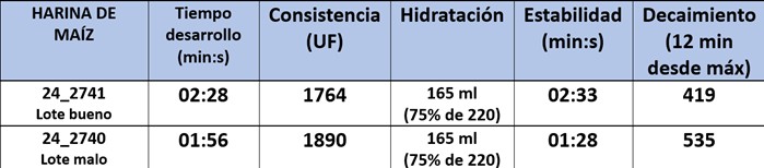 La harina de maíz que funcionó correctamente en línea de fabricación (denominada lote bueno), para la misma hidratación, alcanza menor consistencia, es más estable en el tiempo, y el decaimiento de la consistencia de la masa a los 12 minutos desde el valor máximo, es notablemente inferior.